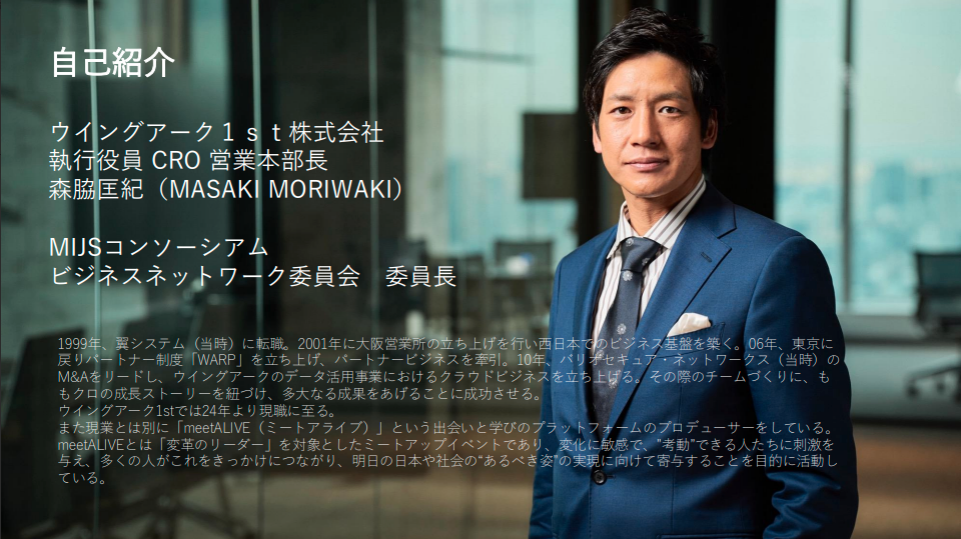 森脇さんは、ウイングアーク1st株式会社の執行役員CSO(Chief Sales Officer ) 兼 営業本部長として、2024年よりご活躍されています。また、MIJSコンソーシアムではビジネスネットワーク委員会の委員長も務められており、2018年からはコミュニティイベント「meetALIVE」のプロデュースにも携わられています。