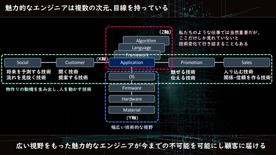 つまり、エンジニアとしての専門分野における知識やスキルの深さを示す「縦軸」だけでなく、エンジニアが担当する業務範囲の広さや、関連する分野の知識の幅広さを示す「横軸」の次元も広げていくことが重要だということです。