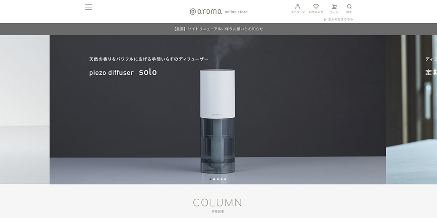 アロマ製品の開発から、香りのある空間までをトータルにデザインする香りの専門企業・アットアロマ株式会社が運営するECサイトのリニューアルを担当しました。ターゲット層である、20代~40代女性向を意識して柔らかくもありながら、洗練されたイメージのデザインに仕上げました。