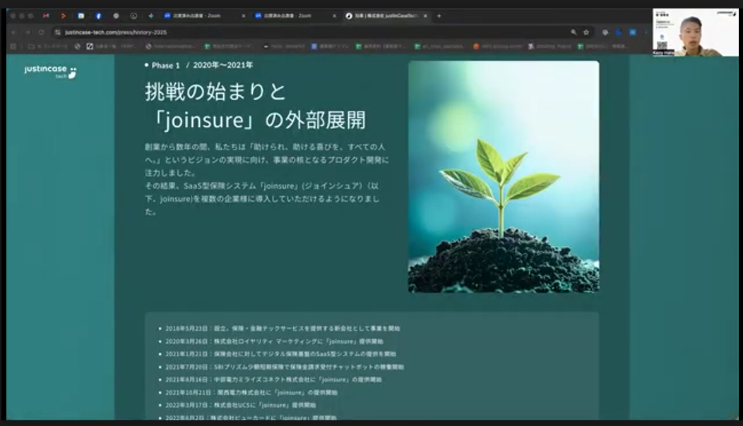 justInCaseTechnologiesの設立から8年目を迎え、当社は新たなフェーズに向かって事業を加速させています。会の冒頭では、代表の畑が、先日当社Webサイトで公開した「会社の沿革」に基づいて、これまでの歩みを振り返りつつ、会社やメンバーへの思いを語りました。創業のきっかけや、経営判断で悩んだこと、「joinsure」を軸に事業をどのように成長させてきたのかなど、普段はなかなか聞くことのできない話を聞く貴重な機会となりました。