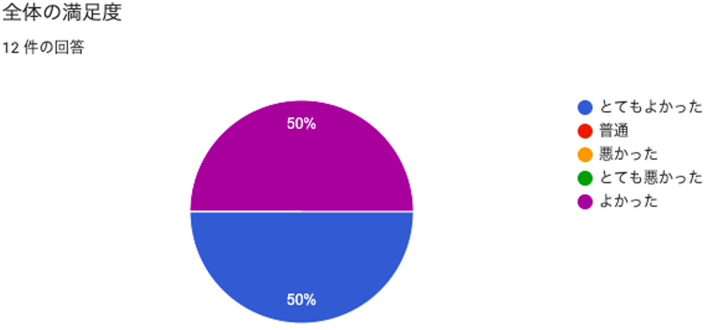 全体の満足度は「とてもよかった」が50%、「よかった」が50%とアンケート回答者の全員が今回の講座に満足していました。先生へのメッセージには「なかなかわからない睡眠について客観的な意見を頂けたのでとても参考になった」、「ゆくるLINEアカウント登録しました」、「要点がまとまっておりとてもわかりやすかったです、有難うございました!」と好回答が続々と寄せられました。
