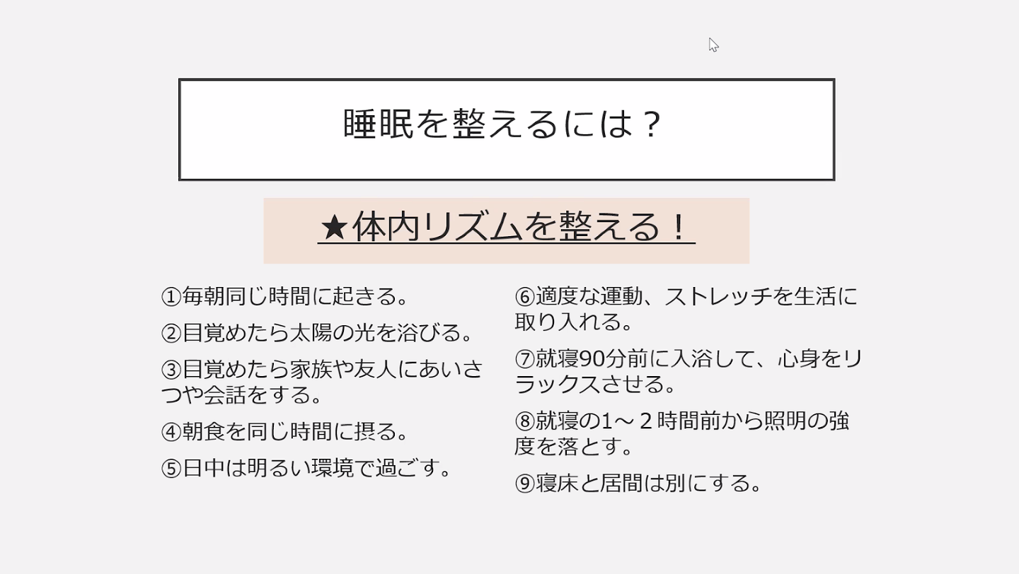 おすすめは7時間睡眠ですが、睡眠時間を確保できない人は「睡眠の質」を上げてカバーすると良いのだとか。上記9項目を実施するよう教えていただきました!