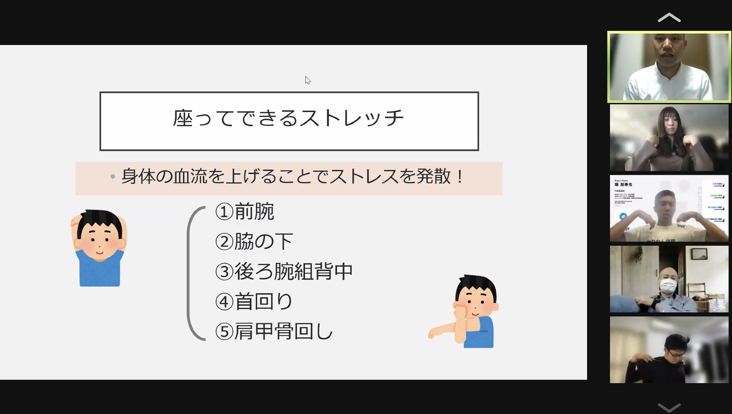 「睡眠負債・脳疲労チェック」で現在の自分の状況を知ったあとは、日頃の疲れをとるため皆でストレッチ。仕事の合間にできる「セルフストレッチ」を先生に直伝してもらいました!メンバーからは「ストレッチパートがあってよかった」、「気持ちがよかった」という声が。