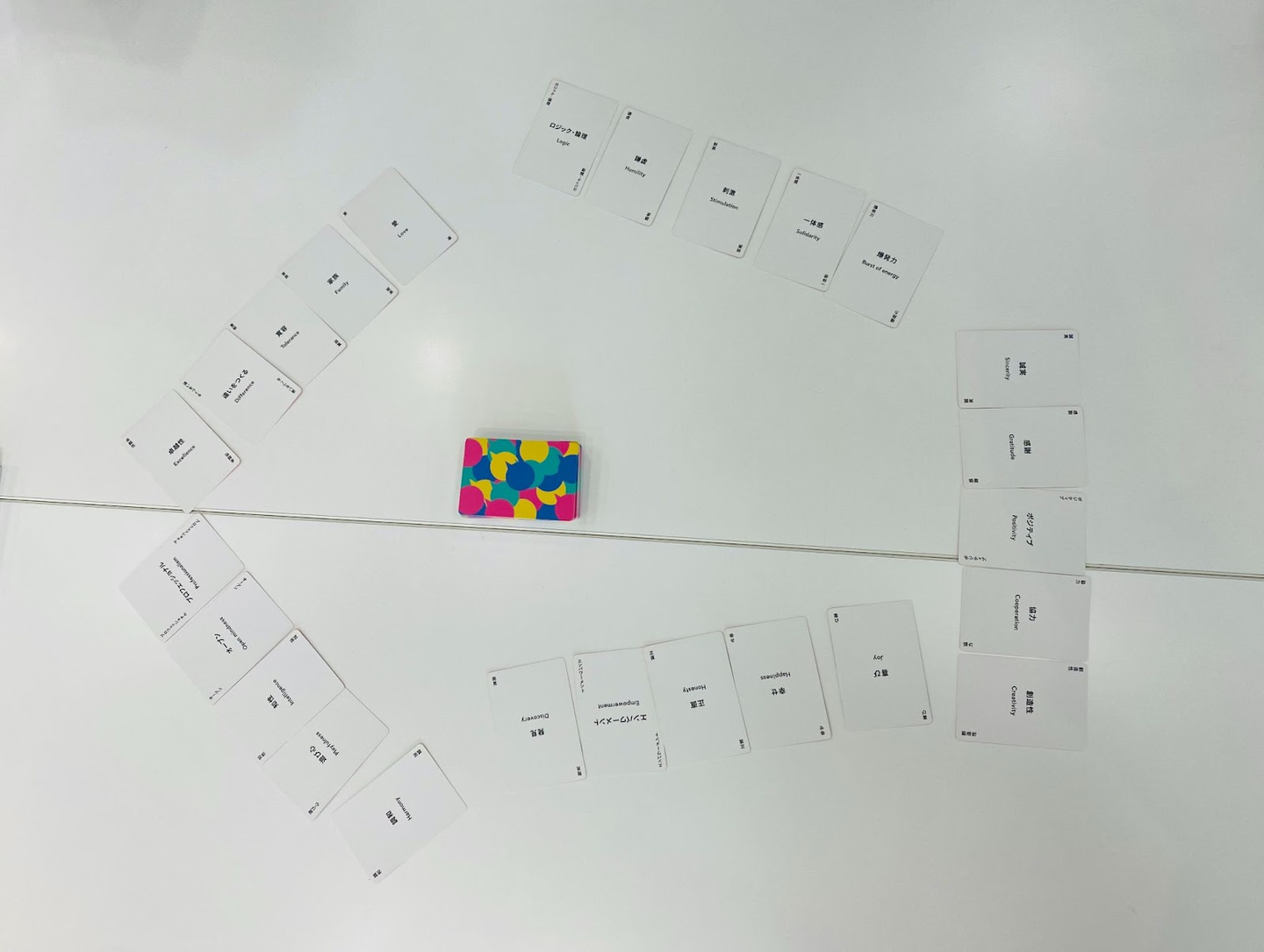 価値観のワードが書かれたカードを一人1枚ずつめくり、「手持ちカード5枚が上限」というルールのなか、自分の価値観にマッチするものを取捨選択。最終的に“5つの譲れない価値観”が手元に残るというもの。5人5色のカード価値観で、メンバーの新たな一面を垣間見ることができました。
