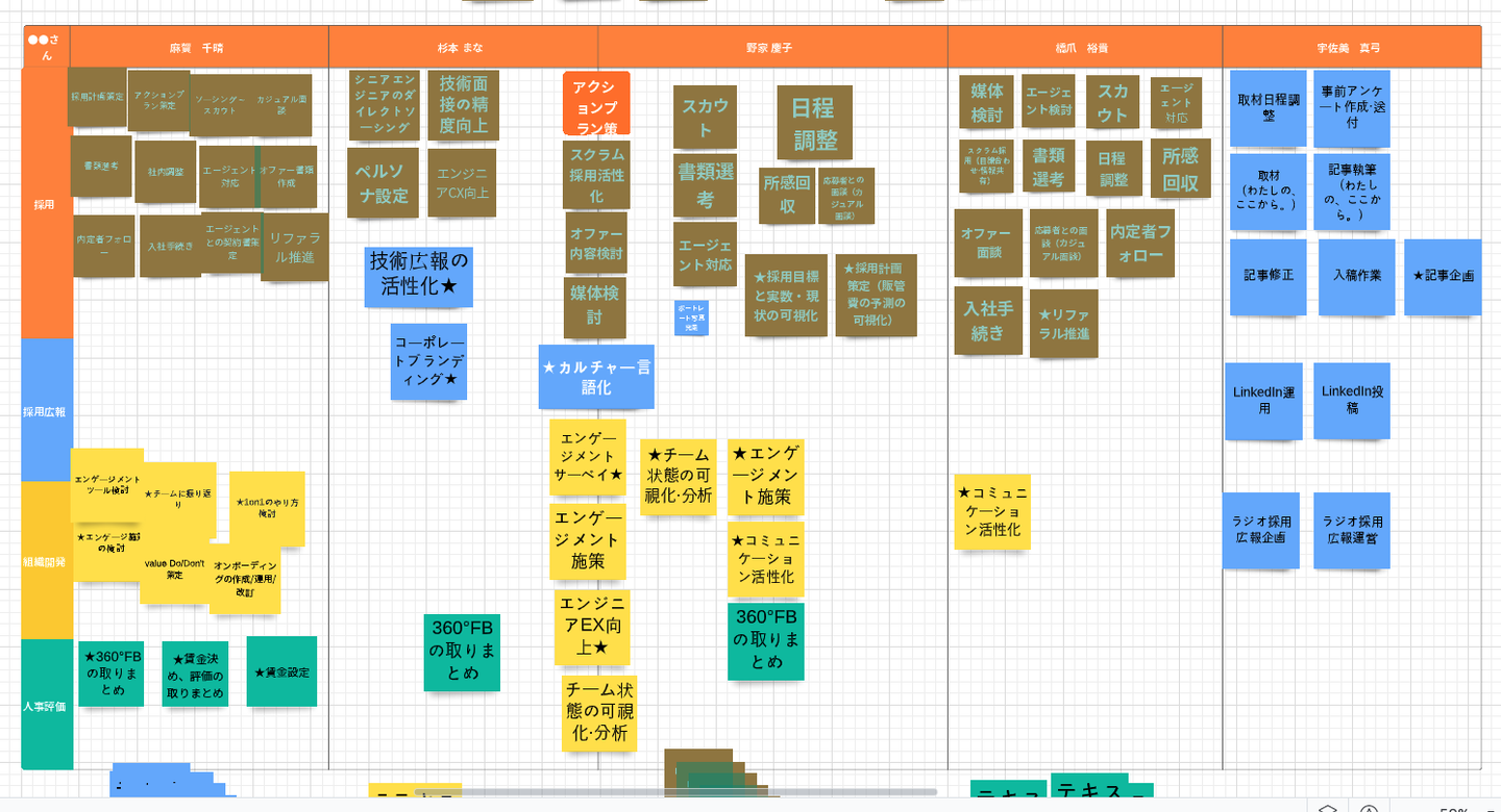 短期間で人事チームが2名⇨5名に拡大されたこともあり、改めて業務分担の整理を行うことに。採用、採用広報、組織開発、人事評価の4分野に分けてそれぞれの業務を可視化。各業務の認識やすり合わせ、検討すべき点を洗い出すことができました。