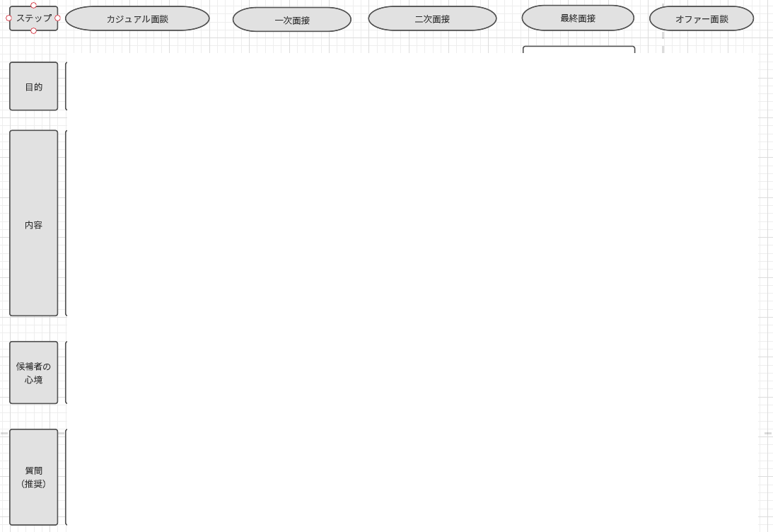 合宿のなかで最も時間を割いたのが、この「採用ストーリー作成」パートです。「カジュアル〜オファー面談」までのステップごとに、目的・面接内容・質問項目に関する「会社・面接官・応募者」それぞれの立場から心境や視点をディスカッション。全ステークホルダーにとって良い面接・良い採用にするにはどうすればいいか、全員が同じマインドで熱く議論しました。