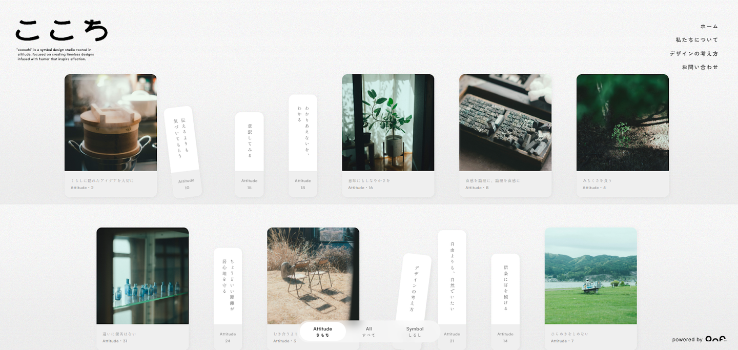 「きもち(体験/Attitude)」「しるし(ロゴ/Symbol)」「ここち(ホーム)」とテーマごとにカテゴライズされてて、それがうまくラベルになっていますね。