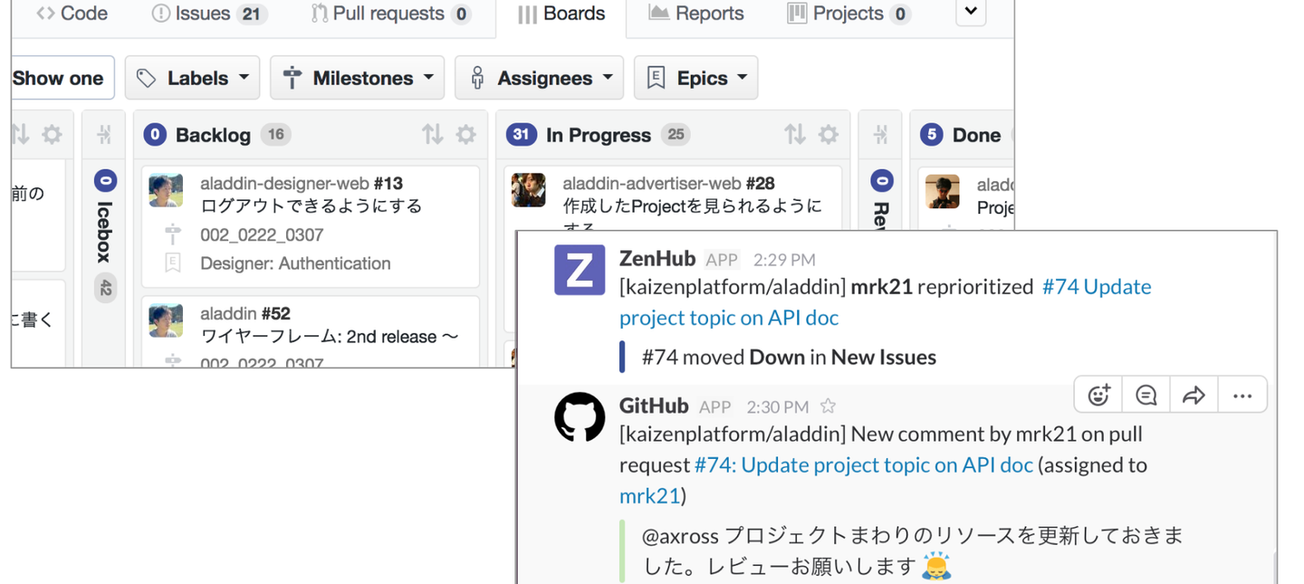んー、2重管理になるため抜け漏れが把握しにくく、まじめにやろうとすると複雑なルールを作ったりと苦しい展開に。そこで、GitHub上でタスクボードも管理できるZenHubを導入。
