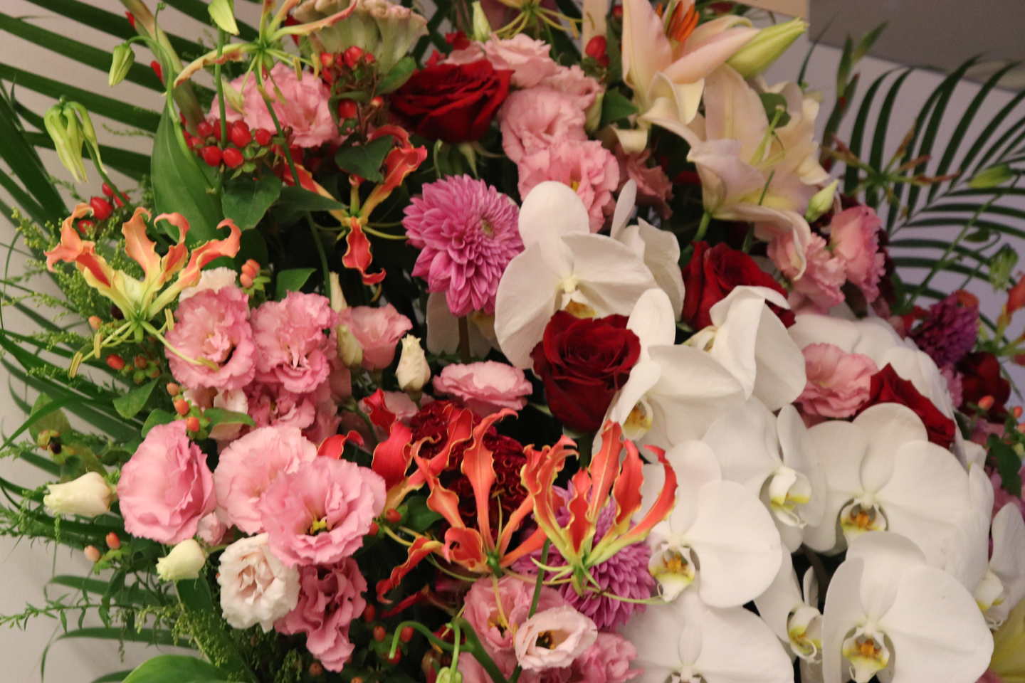 お祝いにいただいたゴージャスなお花で、会場が華やかに!