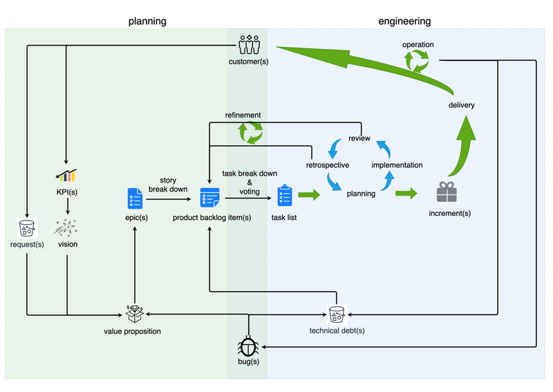 スクラムの考え方に則ったプロセスを徹底しています。チームごとにメンバー全員での議論を重視しており、ソフトウェアエンジニアそれぞれが自身の得意分野をリードしながらも、フロントエンド〜バックエンド〜インフラを横断的に見ているケースがほとんどです。