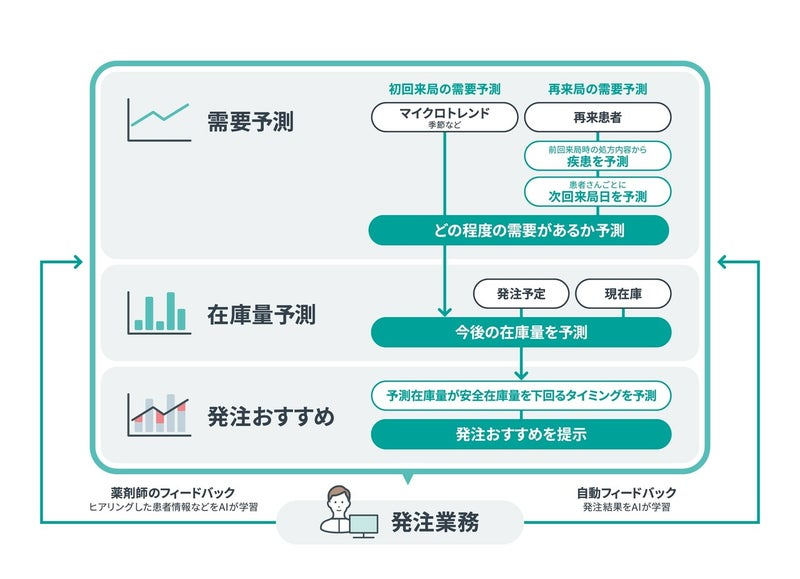 たとえば過去に来局したことのある患者さんの場合、処方箋の情報に基づいて、疾患の種類や次回の来局日、来局時に処方される医薬品の量などが予測できます。一方、初めて来局する患者さんの場合は処方箋に基づいて予測できないので、別のアルゴリズムが必要です。このように、AI在庫管理では再来局と初回来局の2つの予測アルゴリズムを組み合わせて需要を予測し、現状の在庫量を照らし合わせることで、「何日後にどのくらいの在庫量になるか」を見極め、発注するタイミングを明らかにしています。