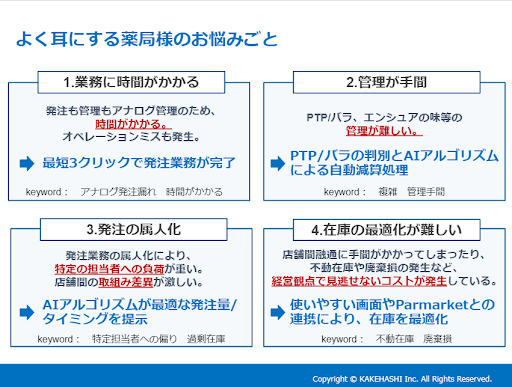 次に、管理が手間であるという課題があります。そもそも薬局の在庫管理に適したコードがない、ということが課題です。これまではそれを各薬局が独自の運用でカバーしていた、もしくはそもそも諦めていたのですが、AI在庫管理では、薬局の在庫管理に適した独自コードを開発することでこの課題を解決しています。