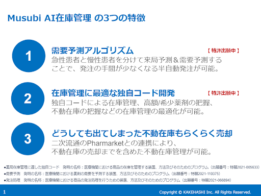 例えば、今回のプロダクトの提供価値として、「来局予測に基づく需要予測」「薬局の在庫管理に適した独自コード」があります。