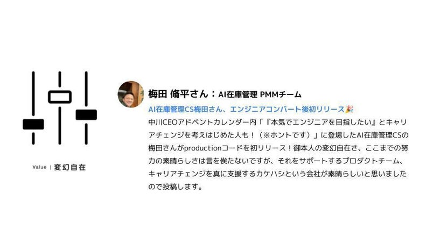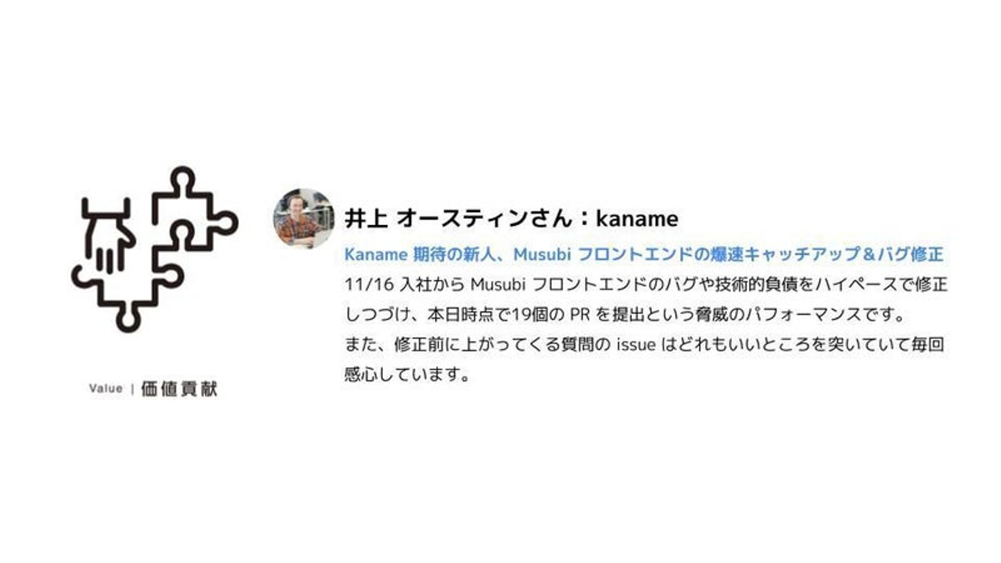 今回届いた称賛は、入社からたった1ヶ月半でバグの爆速修正に携わるメンバーのアクション、専門外の知識を身に着け部署内で力を発揮するメンバーやそれを支えるチームの変幻自在ぶりについて。
