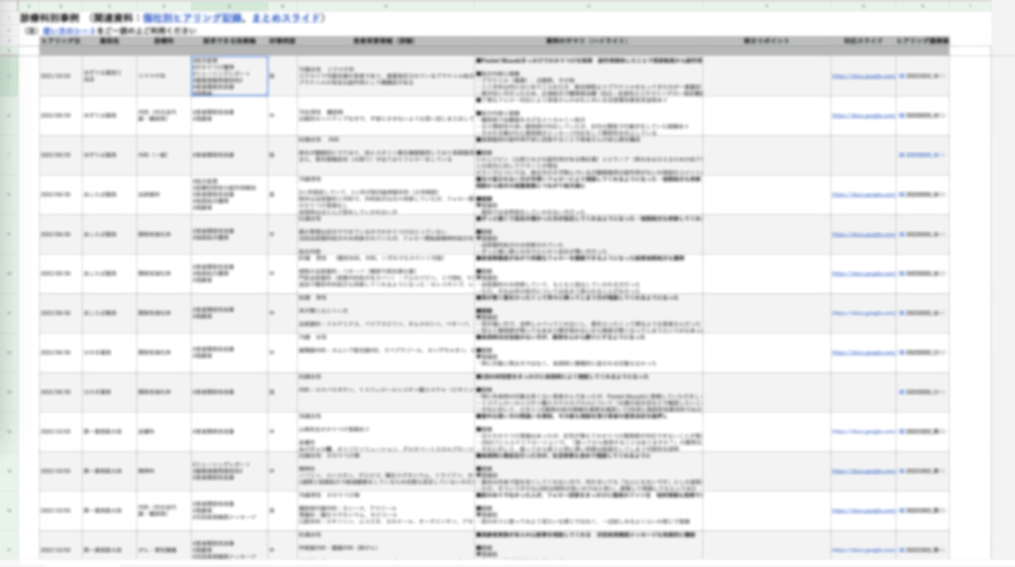 これは、Pocket Musubiをご活用いただいている患者さんを診療科別にリストアップ、そして、具体的な患者さんの様子を薬局さんにヒアリングして内容をまとめたもの。