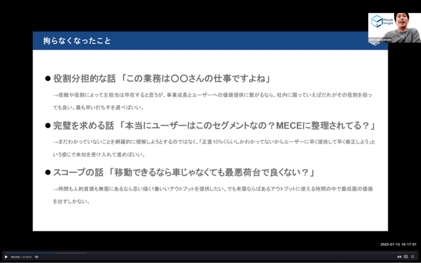 バリューにもある「カタチにする」「変幻自在」などを意識したこれらの取り組みは、わかっていてもなかなかうまくできないことも多いものだなと感じます。中山田さんの本質的な行動や発言から、わたし自身も学ぶ機会をいただいたスピーチの時間となりました。