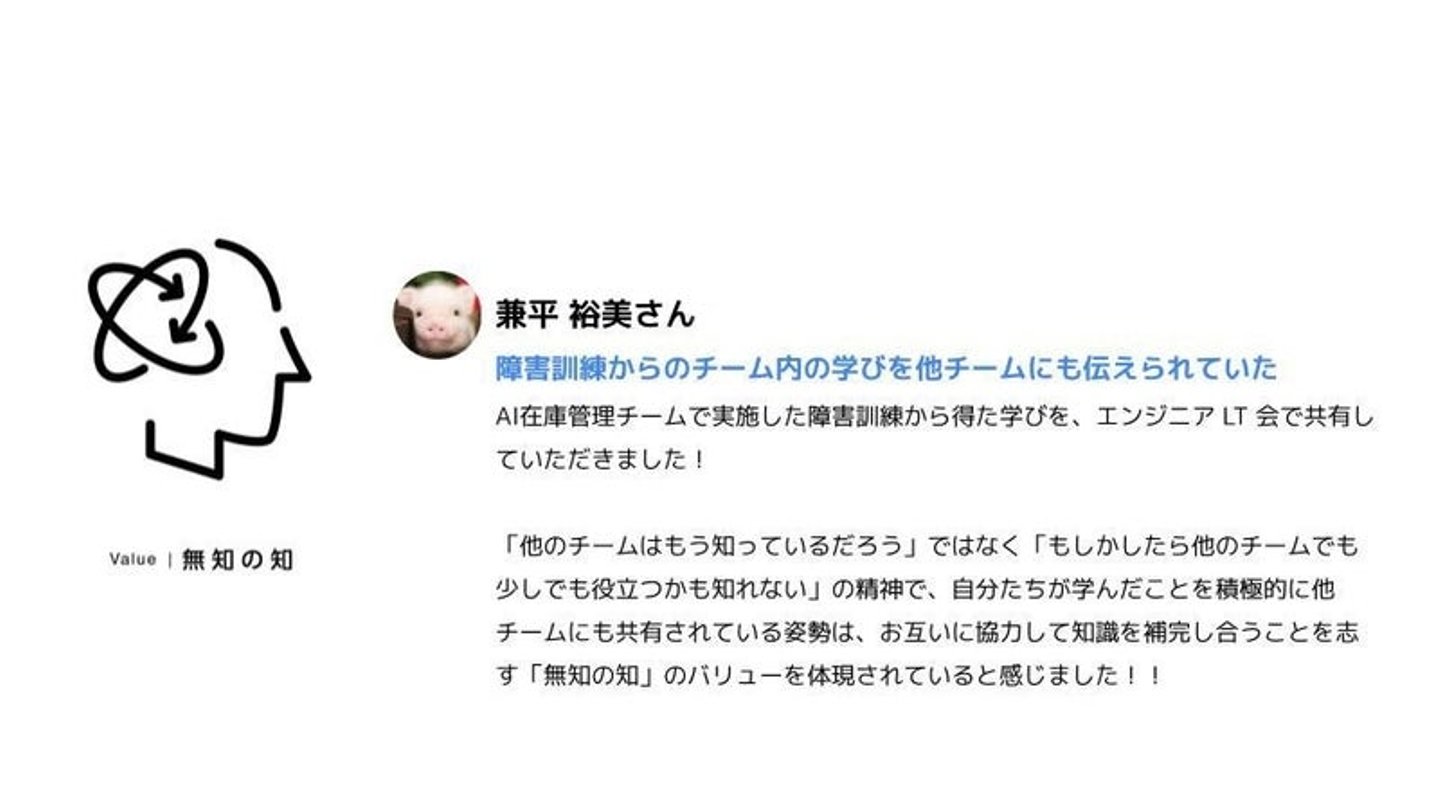 日常に埋もれてしまいがちなメンバーのグッドプレーやファインプレーに光をあてることで、新たな価値貢献のきっかけをつくることを目指して取り組んでいます。