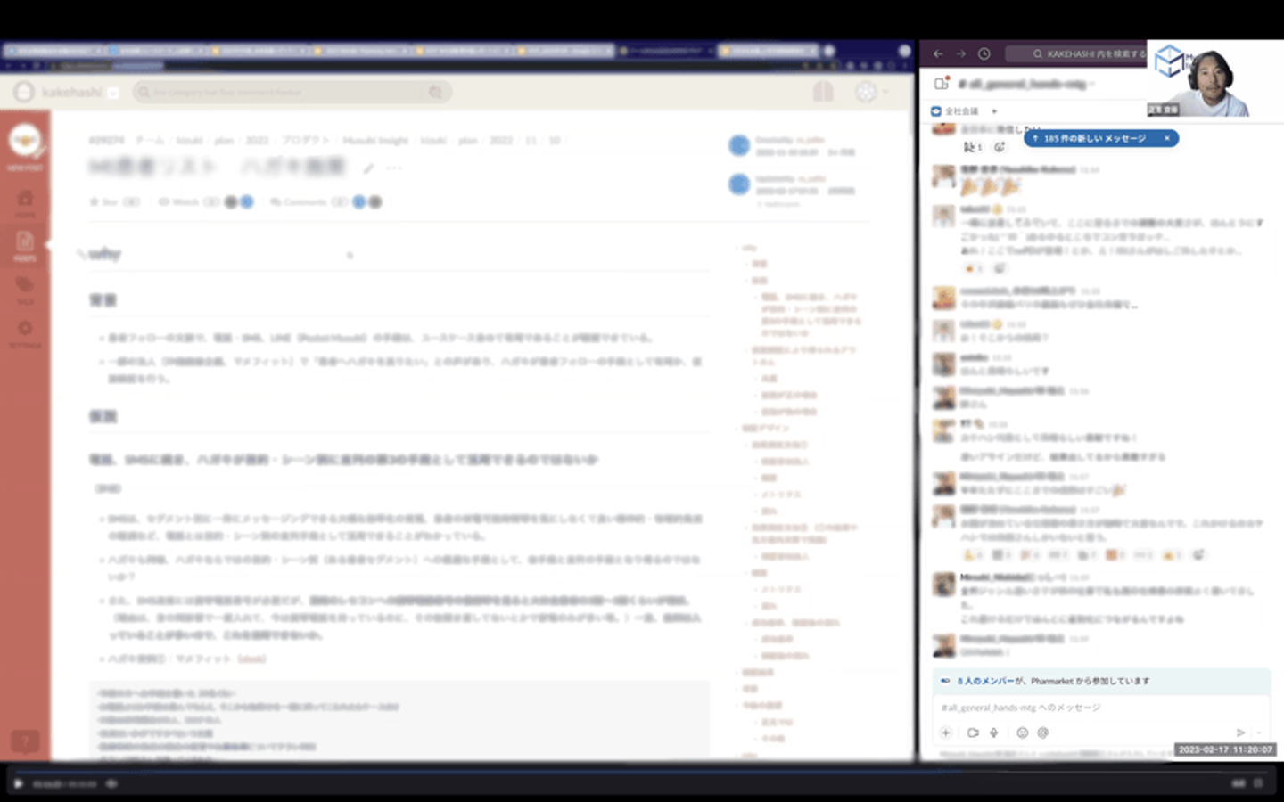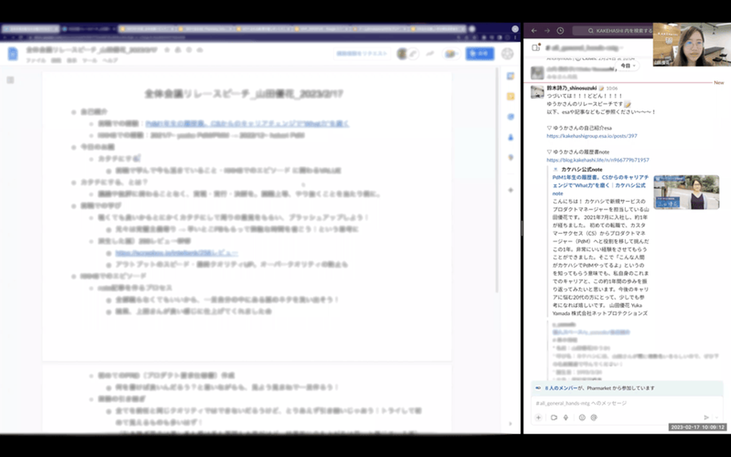 カケハシの全社会議では、メンバーが持ち回りでバリューにまつわるエピソードを語る「リレースピーチ」を行っています。一人ひとりの実体験や声を知ることで、改めてバリューを理解し、自身の活動にも活かしてもらうことが目的です。