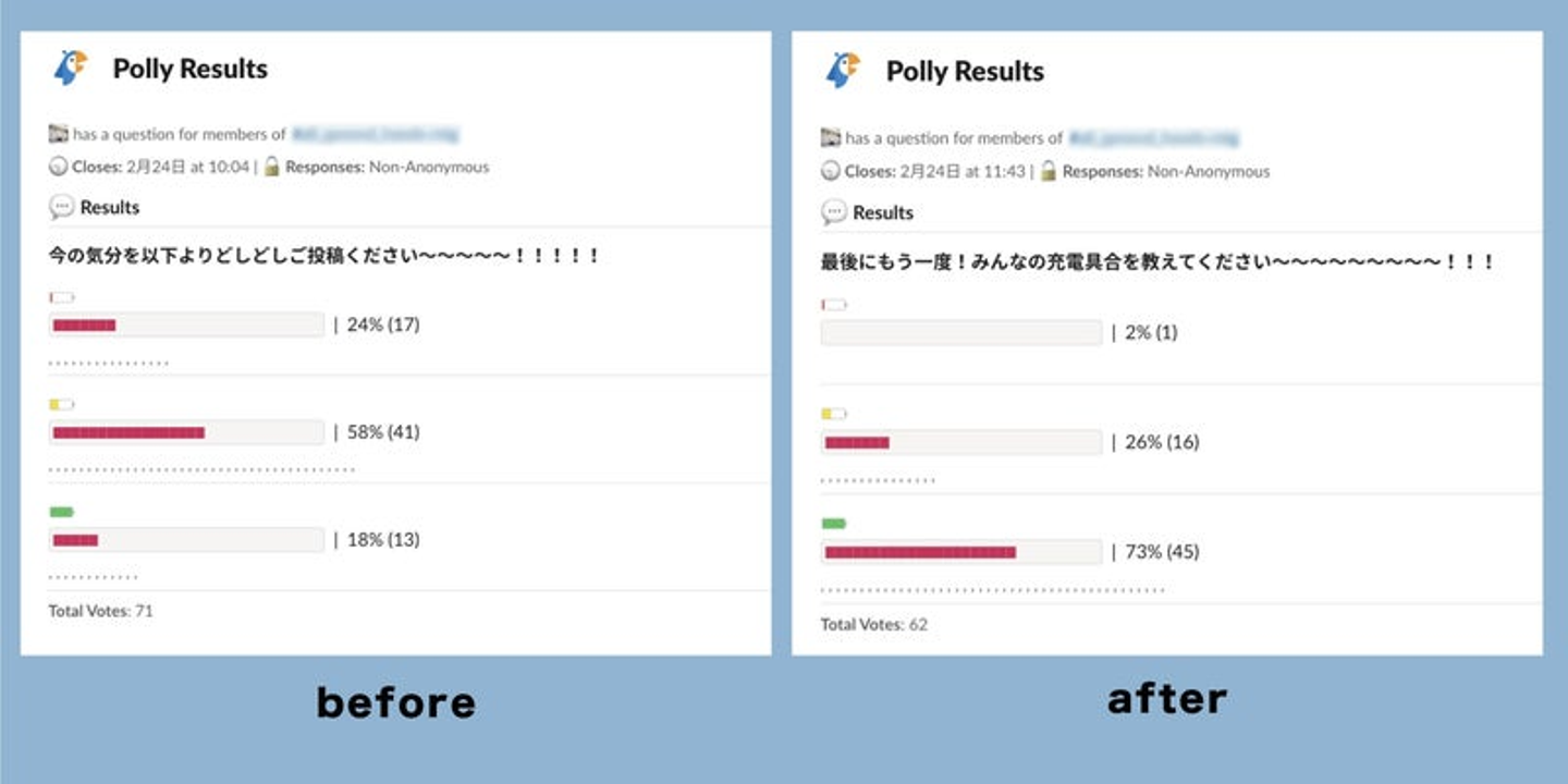 さて、今回からは全体会議の前後にPollyというSlack上でアンケート集計のできるサービスを取り入れてカケハシメンバーの充電レベルを計測しました。その結果がこちら……!