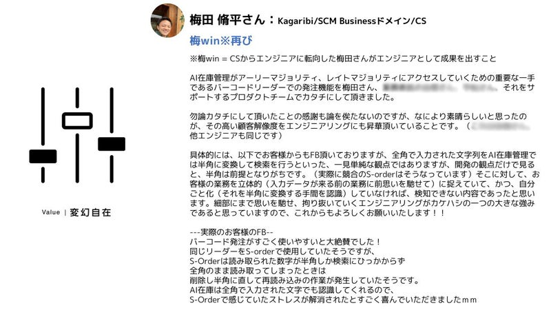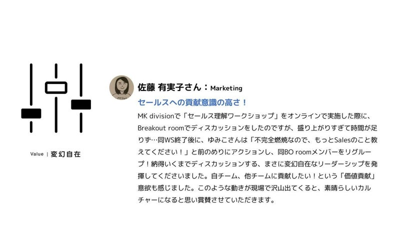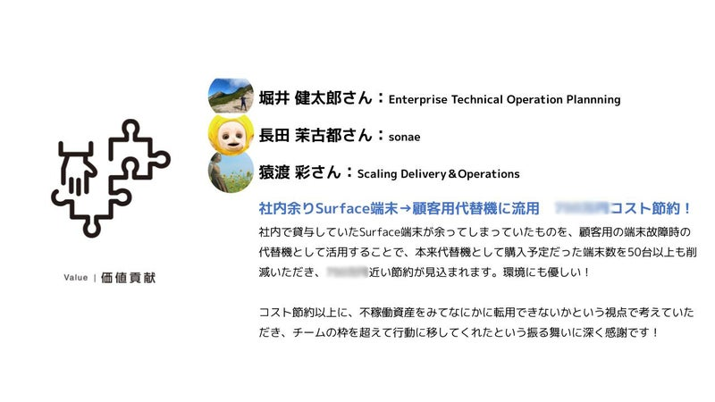日常に埋もれてしまいがちなメンバーのグッドプレーやファインプレーに光をあてることで、新たな価値貢献のきっかけをつくることを目指して取り組んでいます。