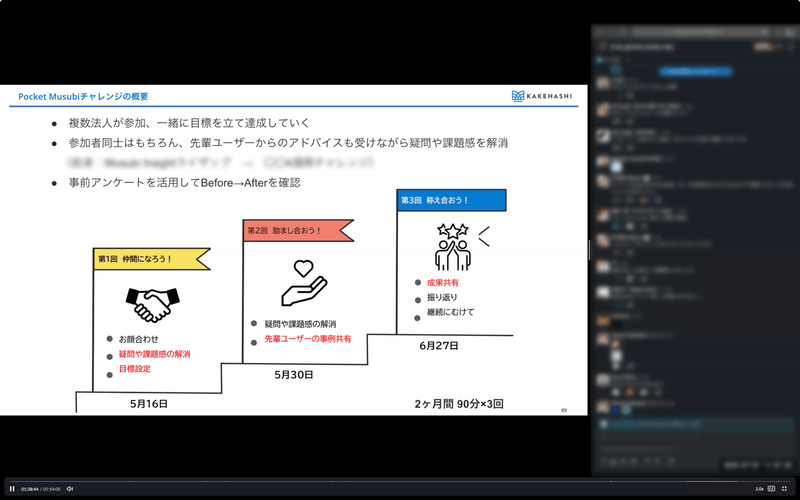 「Pocket Musubiチャレンジ」とは、薬局・薬剤師のコミュニティ「MusuViva!」と、カスタマーサクセスチームとでおこなった、薬剤師さんの行動変容を促す取り組み。カケハシのプロダクトを導入いただいた薬局さんを対象に、コミュニティに参加している先輩ユーザーさんのサポートを通して、上手な活用方法や価値実感を促進するねらいがあります。