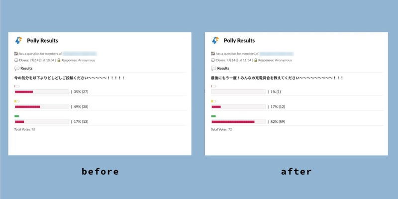 また、そんな充電具合をメンバー同士で共有するべく、カケハシではPollyというSlack上でアンケート集計のできるサービスを取り入れています。果たして、全体会議の前後で充電具合に変化はあったのでしょうか……!