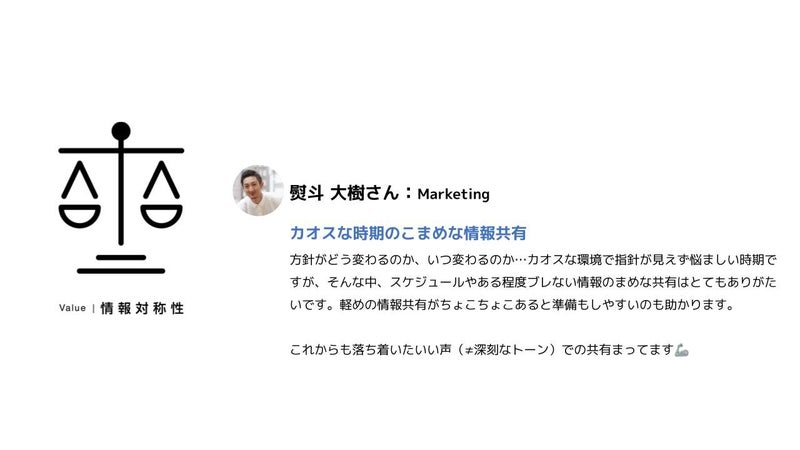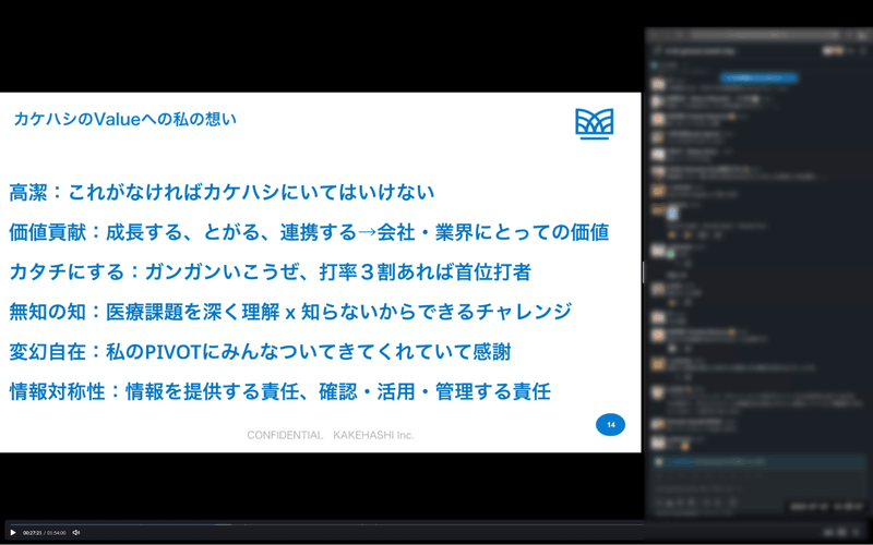 そのほかにも、カケハシにある6つのバリューに対して、ご自身ならではの言葉で理解し、翻訳を行い解説をしてくれた今回。一人ひとりがバリューを自分ごと化し、馴染ませるために重要な時間だったのではないかと思います。