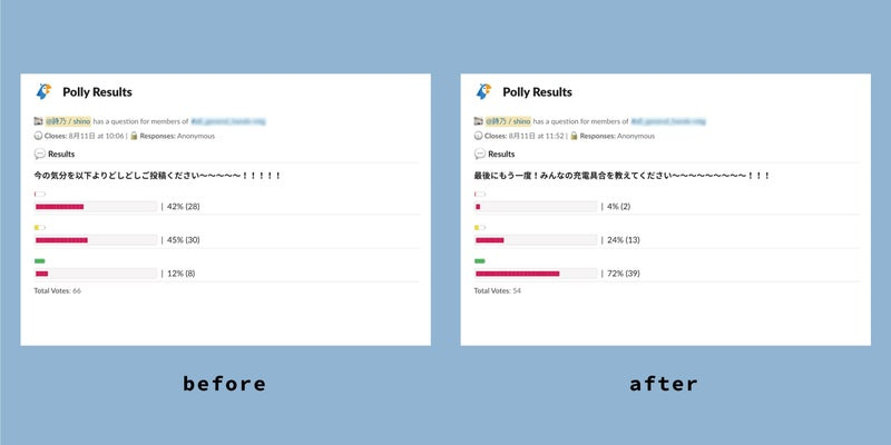 また、そんな充電具合をメンバー同士で共有するべく、カケハシではPollyというSlack上でアンケート集計のできるサービスを取り入れています。果たして、全体会議の前後で充電具合に変化はあったのでしょうか……!