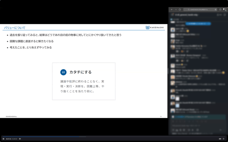 カケハシの全体会議では、メンバーが持ち回りでバリューにまつわるエピソードを語る「リレースピーチ」を行っています。一人ひとりの実体験や声を知ることで、改めてバリューを理解し、自身の活動にも活かしてもらうことが目的です。
