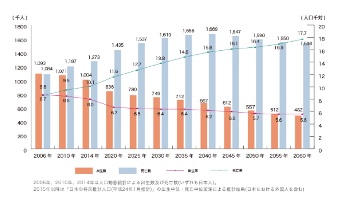 2025年には団塊の世代が後期高齢者になります。そこから日本の人口のボリュームゾーンが寿命を迎える2040年に向けて、死亡者数は年々増加し、それとともに高齢化率も進行していきます。