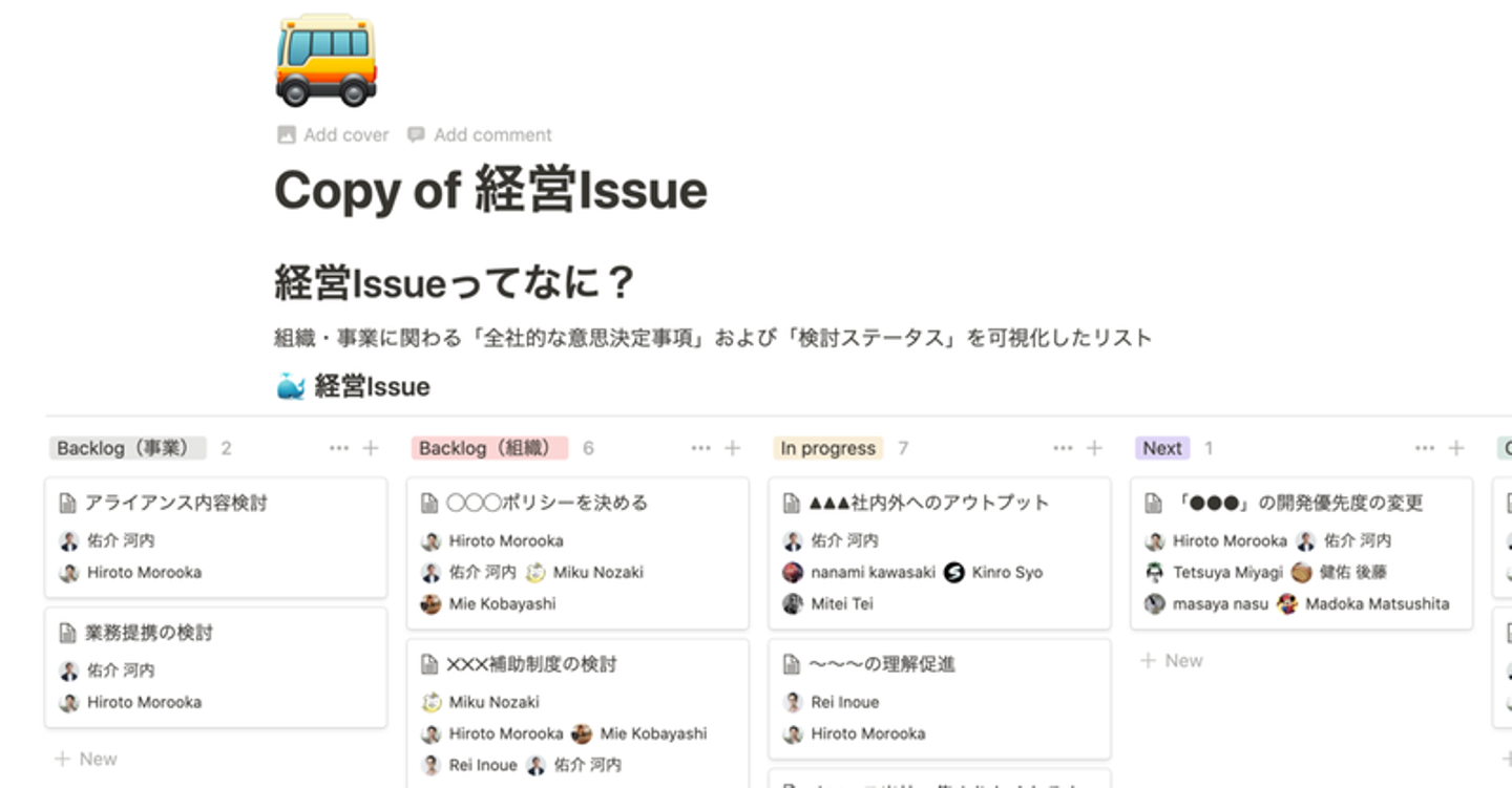 カミナシではNotionで経営上の課題を社内向けに公開することにしました。そして、誰でも参加できる毎週1回の会議体で、それぞれのカード(Issue)について意思決定する場を設けました。
