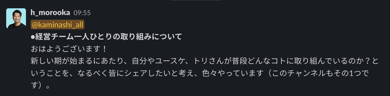 ボードメンバーも社内Slackで定期的に各自が現在取り組んでいることや、CEO諸岡は「CEO日報」として日々考えていること、気づきなどを発信しています。