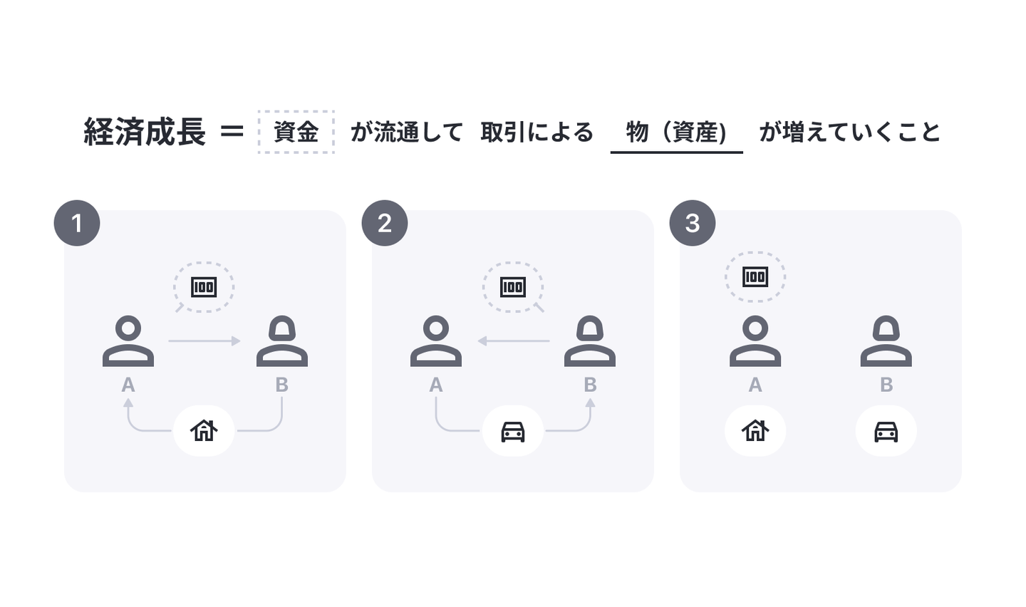 たとえば、AさんとBさんがいて、AさんがBさんに家を建てるようにお願いをした。Aさんが100万円渡してBさんが100万円を得て、Aさんは家を得た。今度はBさんが、その100万円を、Aさんに渡して車を作ってもらった。そうなるとAさんの手元には100万円が戻ってきて家があり、Bさんには車がある。結局100万円自体は、増えても減ってもいないけど、家と車を手に入れられた……ということが経済です。