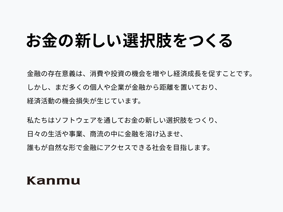 カンムは2024年2月に、新たなミッション「お金の新しい選択肢をつくる」を公表しました。ミッションを策定するに伴い、社内ではプロジェクトが立ち上がり、八巻や経営メンバーを中心に議論がされました。今回はミッションに込められた思いや背景について、代表の八巻に聞きました。
