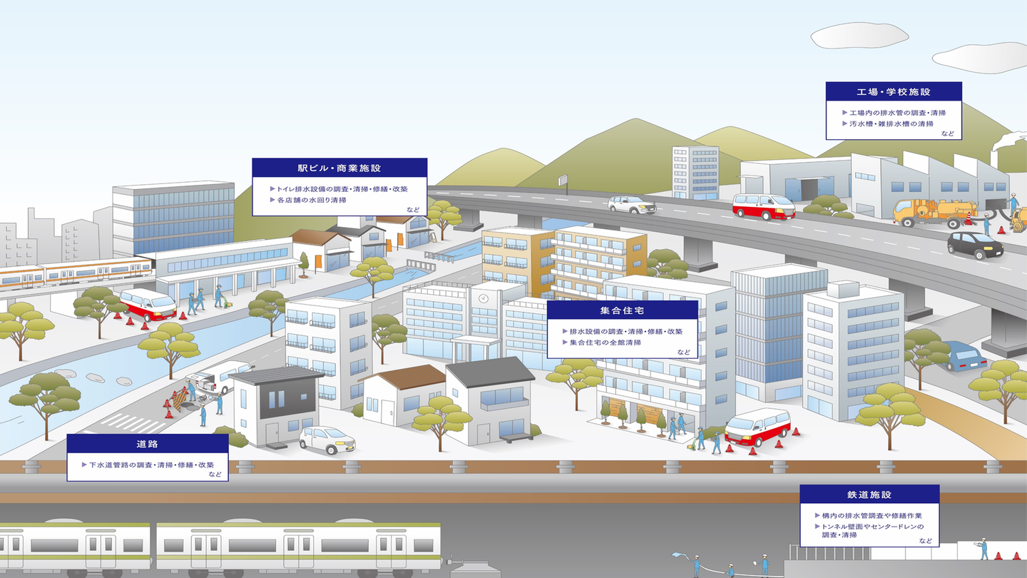 下水道管路管理のパイオニアとして、公共下水道の調査・清掃・補修・コンサルティングや、建物内の排水設備管理などを手がけています。