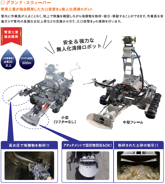 以上、今回はテレビカメラ調査システム「グランドビーバーシステム」・無人化清掃ロボット「グランド・スウィーパー」を中心にご紹介いたしましたが、いかがでしたか?