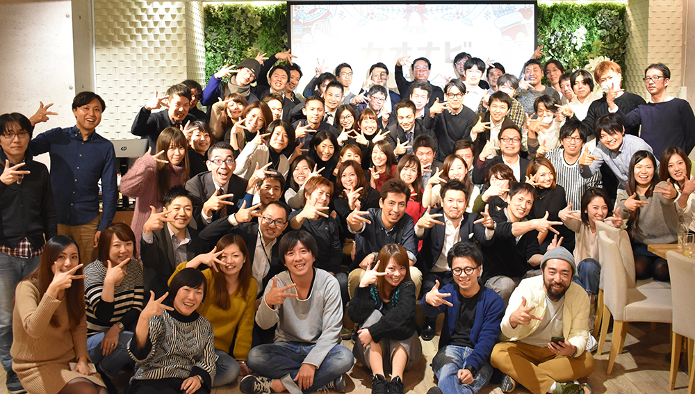 今月開催した忘年会にて。全員で「カオナビ」の頭文字「K」のポーズ(ちょっと違うメンバーも…!)