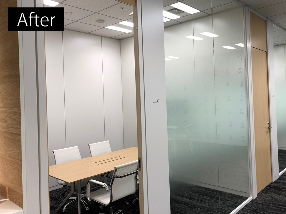 アフター:個室の会議室になりました。木目と白ですっきりシンプルな会議室です。