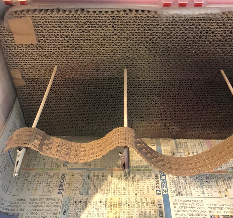 特にしんどいのはキャタピラで、ネコの手(※4)で持つこともできないし、どうしようか?と悩んだ結果が以下の写真。頭良くないですか?