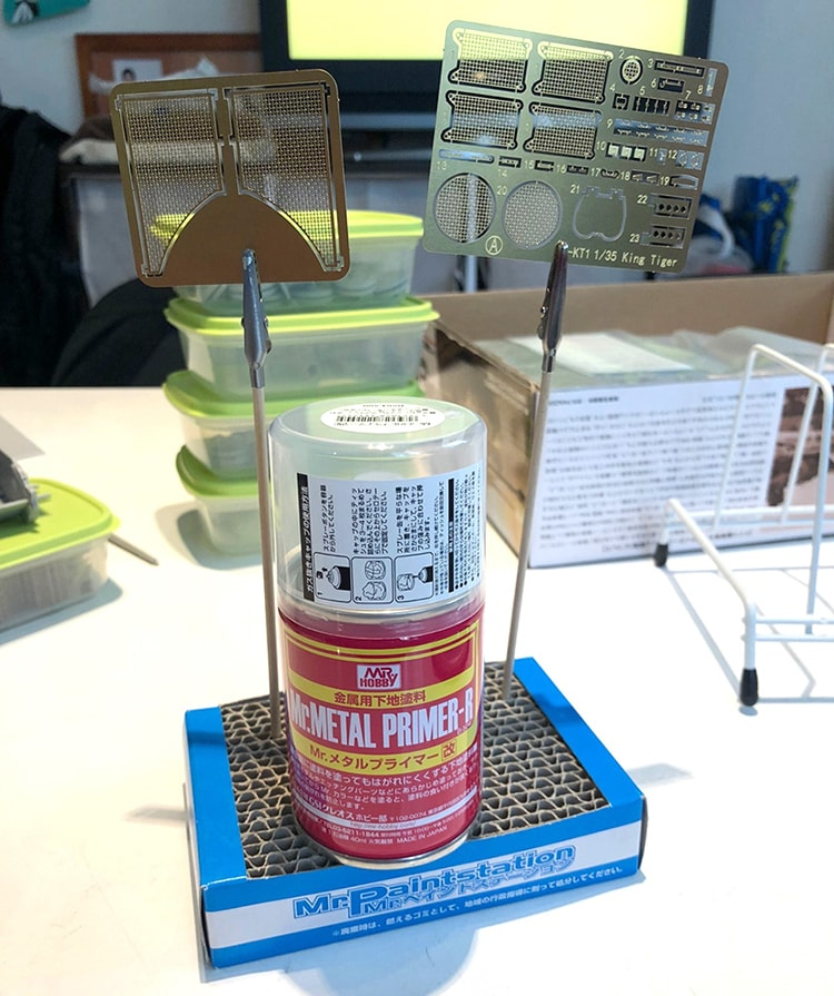 まず、エッチングパーツ(※1)に塗料が乗るようにメタルプライマー(※2)を吹きます。