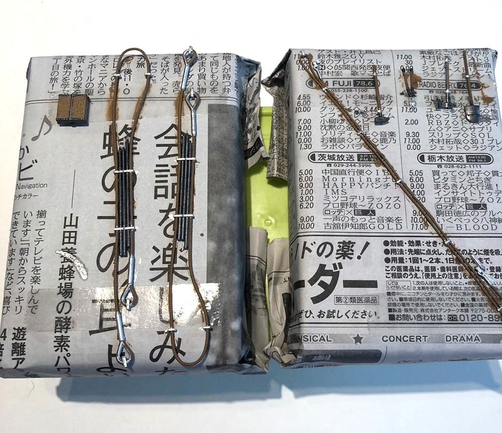 新聞の上に両面テープを貼って固定し、気合い入れて塗ります。