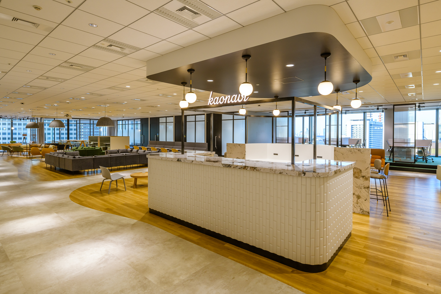 そんな中、カオナビは、働き方を選択するのは「企業」ではなく「社員」であるべきだと考え、これからの時代は、出社することは「義務」ではなく、社員の「権利」であると考えました。新しいオフィスのコンセプトは「(T)OWN」です。所有物という意味の「OWN」に「T」を足し、タウンとしました。社員が自らの場所として、心地よく働いてもらいたい、という思いを込めています。整然とデスクが並んだようなオフィスではなく、街(タウン)をイメージした素敵なオフィスとなっています。