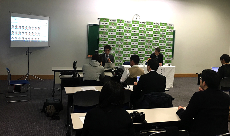 そして、夕方からの会見には多くの地元メディアの方々にお集まりいただき、カオナビとは何か?なぜレバンガ北海道が導入することになったのか?などデモを交えてご説明。