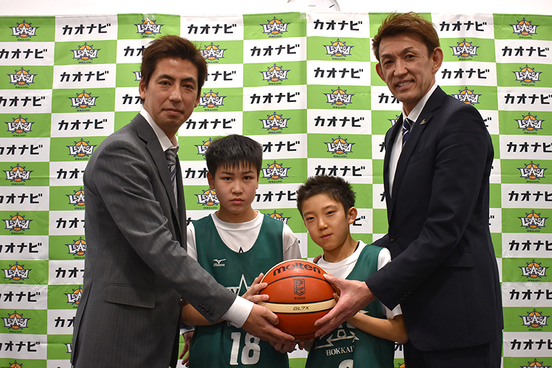 (左から当社代表 柳橋、アカデミー生の山根くん、田上くん、レバンガ北海道 代表 折茂さん。