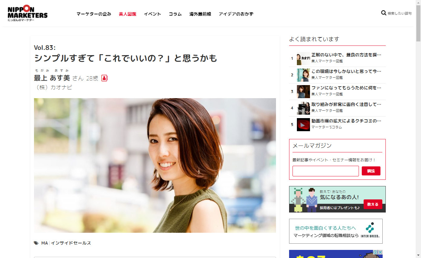 「美人マーケター図鑑」のコーナーで、インサイドセールスの最上を前編・後編の2回にわけてご紹介いただいています。