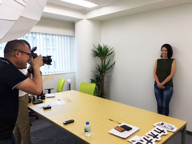 取材当日、まずは社内でインタビュー後、会議室の壁をバックに撮影開始。