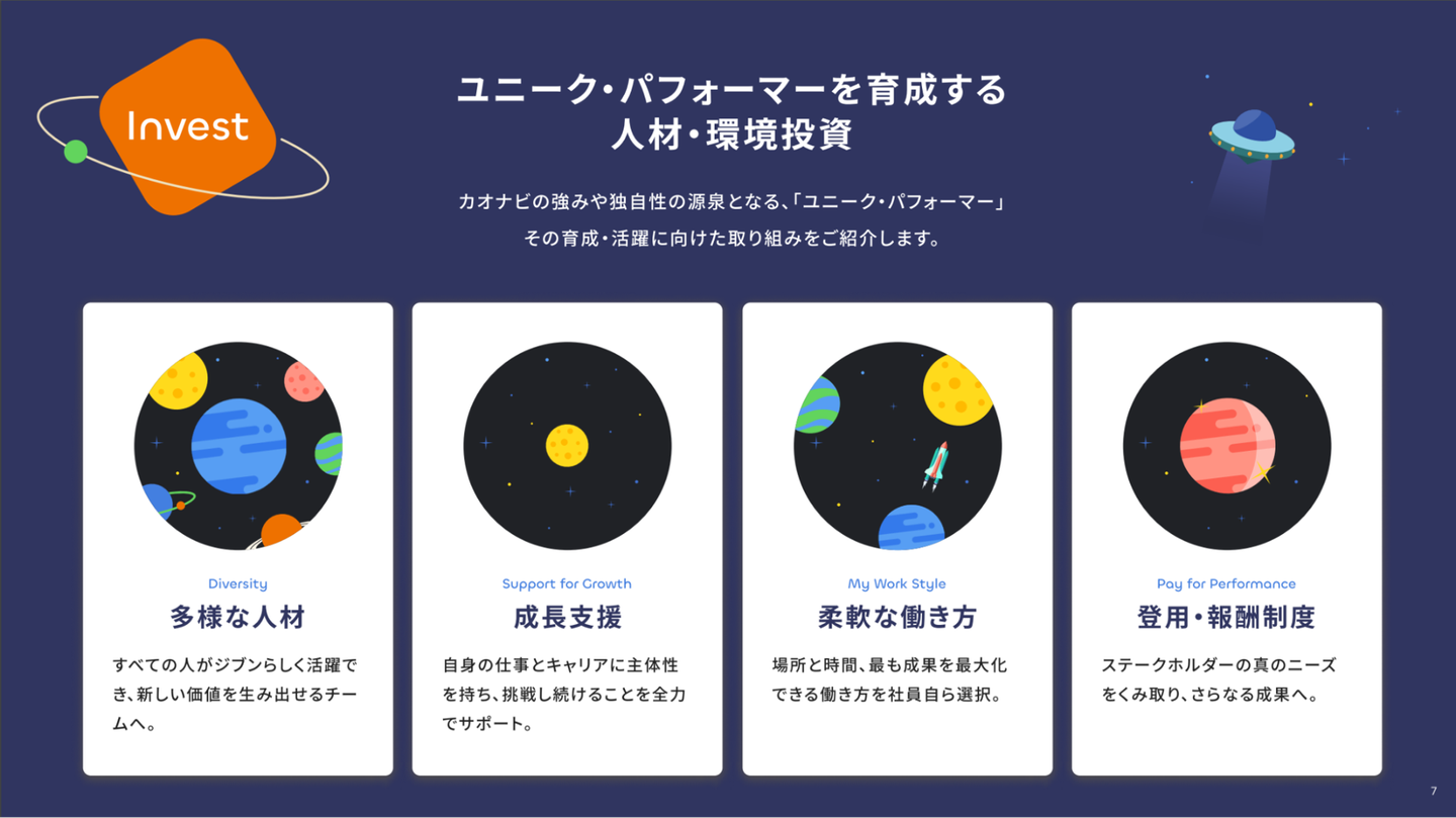サイトのコンセプトは「人の個性は無限の可能性」。多様な個性、価値観を大切にするカオナビらしさをクリエイティブ面でも追求し、人的資本に関する考えと独自指標を含む20項目以上の指標を公開しています。