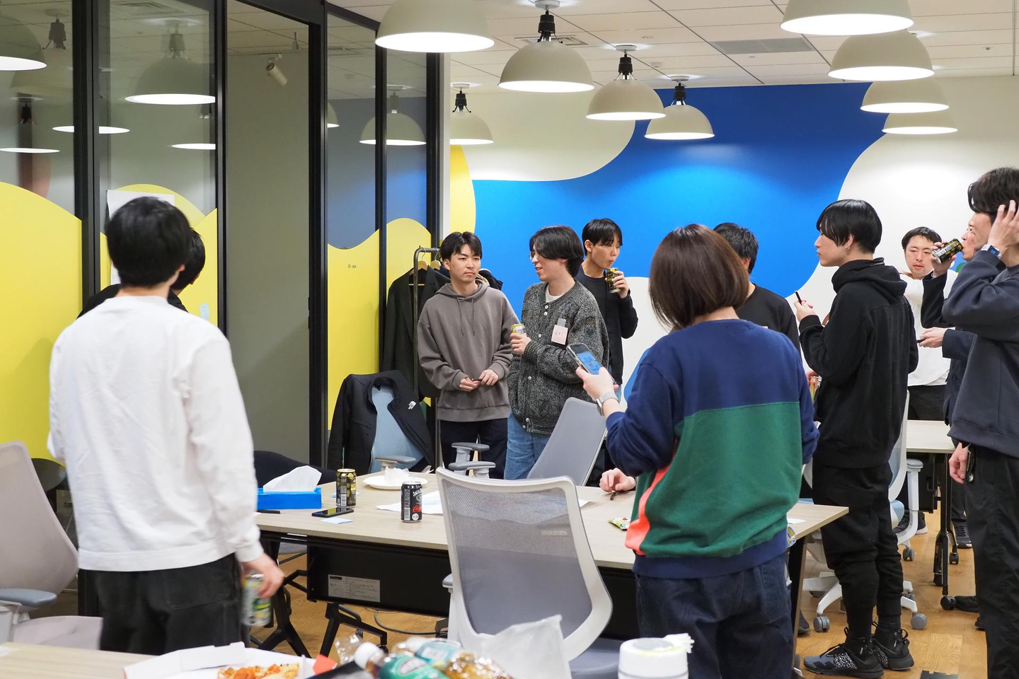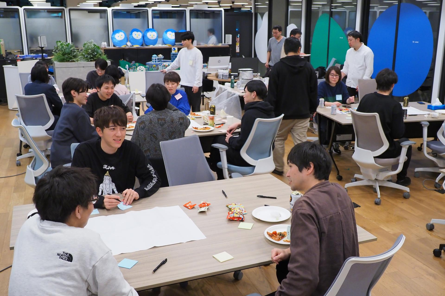 普段なかなかオフラインで集まる機会も少ないので、最初からチームをまたがってあちこちで盛り上がっていました。
