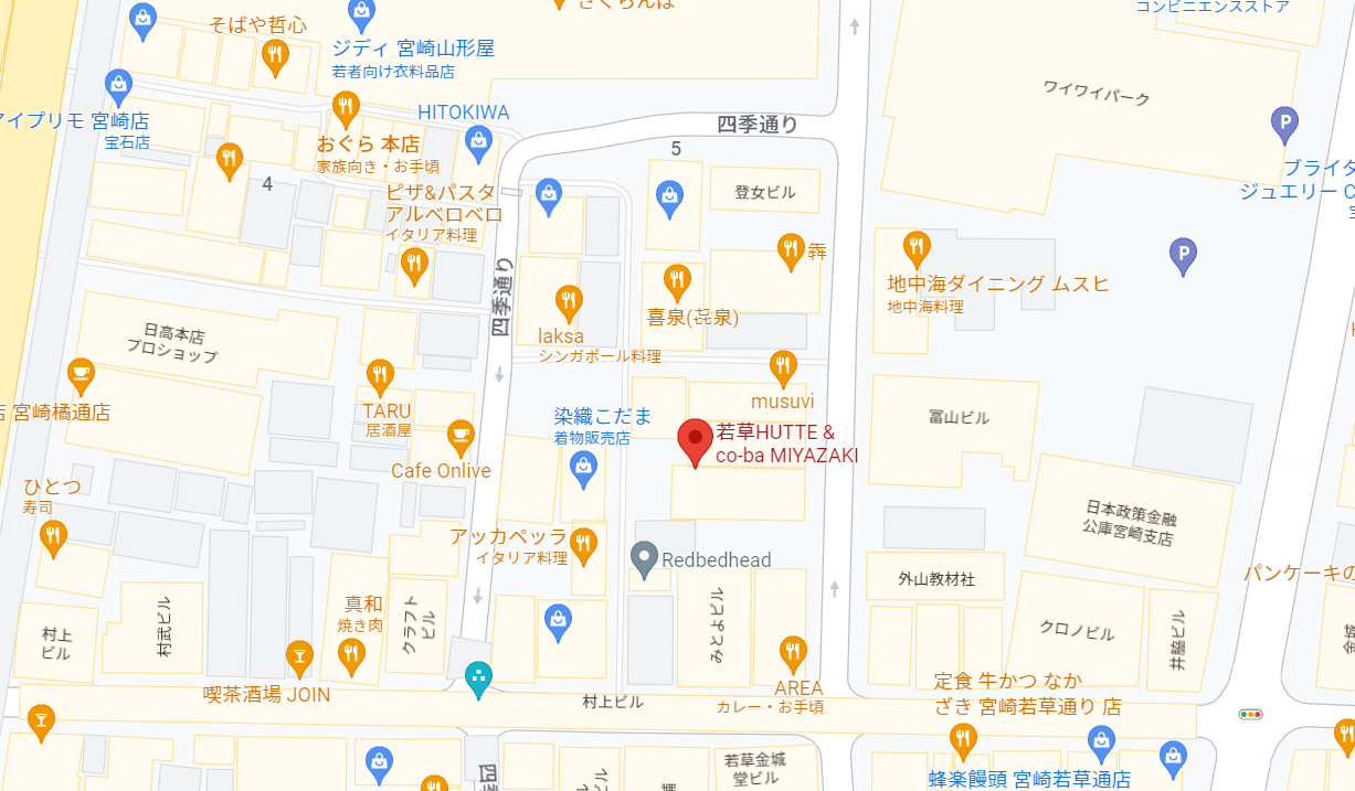 宮崎オフィスは「若草hutte & co-ba miyazaki」の2階に位置しています。