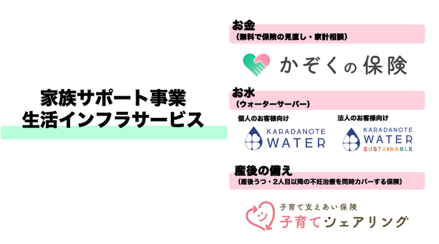 【家族サポート事業】は、名前の通り家族を直接サポートする事業。カラダノートが深く入り込み、家族ユーザーの課題やお困りごとをサポートする事業です。保険代理事業や宅配水事業などが該当しています。